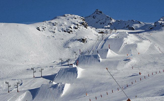 Accès au snowpark par la remontée de Moutière, à proximité du rond-point des pistes et de Eskiador Val Thorens.